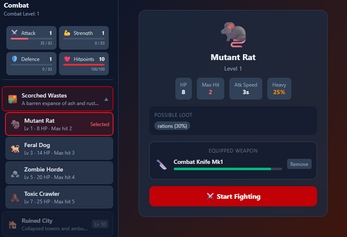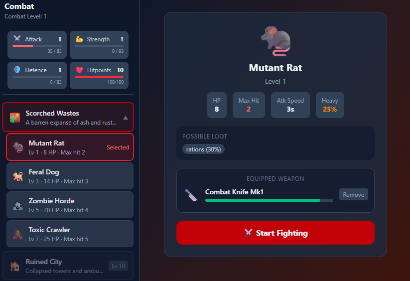 Wasteland Protocol is a browser-based idle RPG set in a post-apocalyptic wasteland. Scavenge scrap, excavate buried circuits, build up power — then fight your way through four increasingly hostile regions to reach an abandoned launch site and escape the planet.